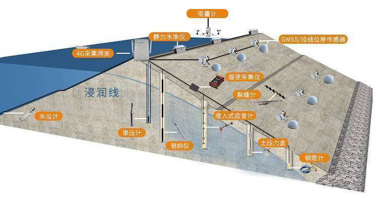 内部监测主要包括温度监测、混凝土应变力(压力)监测、钢筋应力监测及锚索应力监测等。土石坝而言,其压力(应力)监测主要包括孔隙水压力、土压力(应力)、接触土压力以及混凝土面板应力等。混凝土坝而言,其内部监测主要包括坝体(坝基)应力监测、锚杆(锚索)应力监测、钢筋应力监测、钢板应力监测及温度监测等。值得说明的是,在进行内部监测的同时,应与变形监测、渗流监测项目相结合。